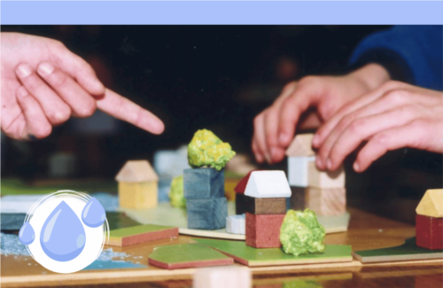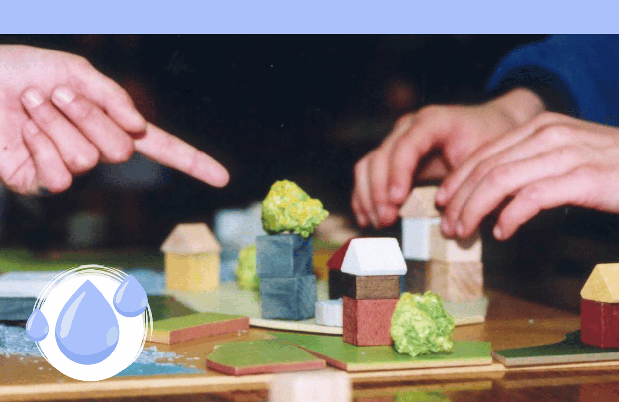 Par groupe, les élèves créent les maquettes de paysages (cultures, constructions humaines, relief, nature, rivière…). Ils présentent leurs productions. L’animateur les assemble pour former un bassin versant. Des échanges sont alors suscités pour apporter du vocabulaire et favoriser le questionnement ou le débat. La séance se termine par un travail sur carte pour connaître la situation géographique et hydrographique locale.