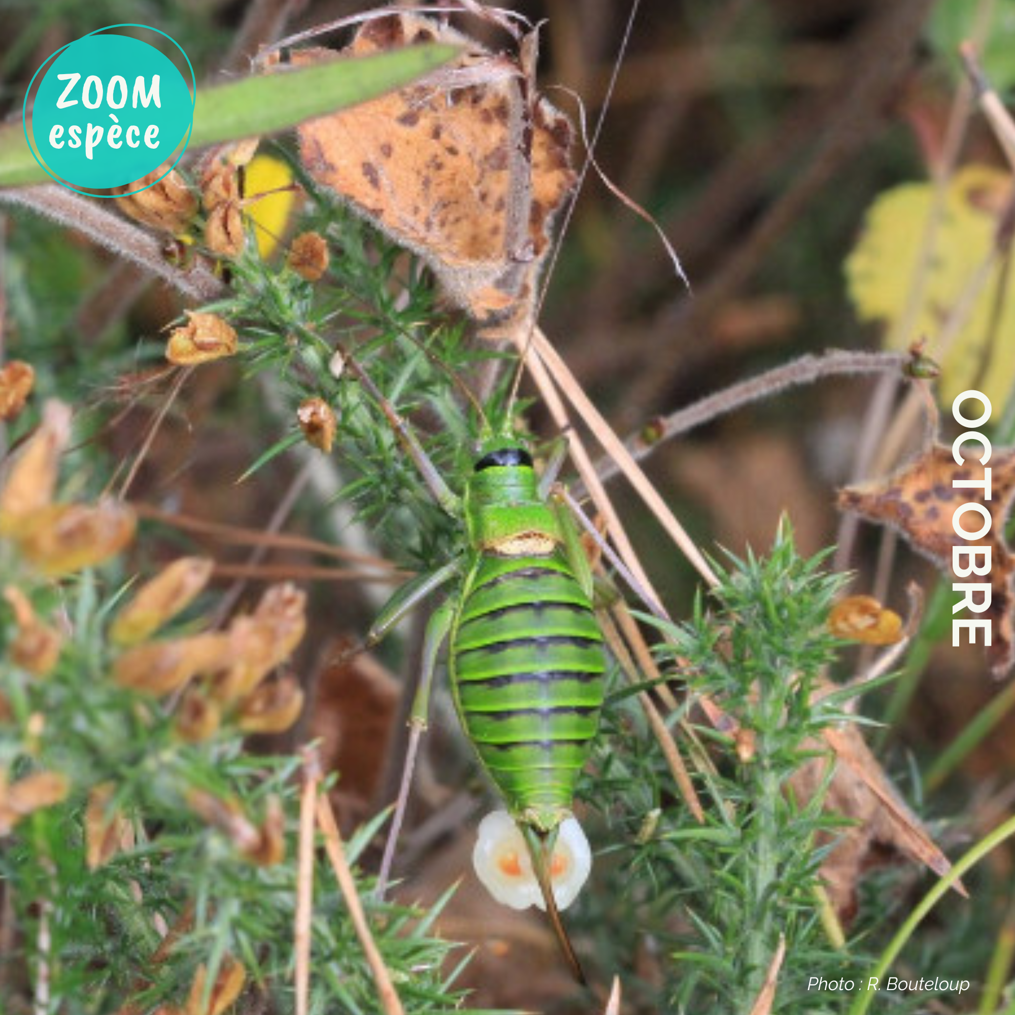 espèce est simple à reconnaître : c’est une grande sauterelle qui mesure jusqu'à 30 mm, aux ailes atrophiées la rendant incapable de voler. Son abdomen imposant est rayé de vert clair et vert foncé, et l’arrière de la tête est noir.La femelle possède un long organe de ponte (oviscapte), en forme de sabre légèrement recourbé vers le haut. Le mâle possède deux épines à l’arrière, les cerques.